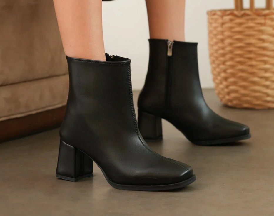 Kadın Siyah Deri Fermuarlı Topuklu Bot