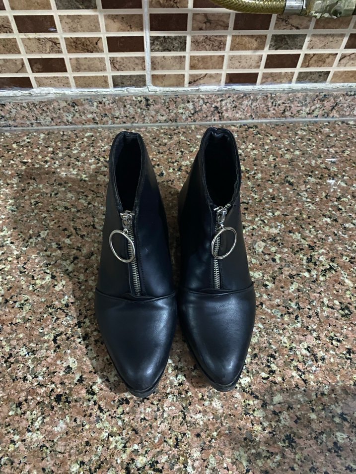 Siyah deri, blok topuklu kadın botları, ön fermuar ve halka detaylı. Minimalist ve gotik tarzda, günlük kullanıma uygun. Bir kaç defa giyildi bir sorunu yoktur.(kullanılmayan tezgahtır)