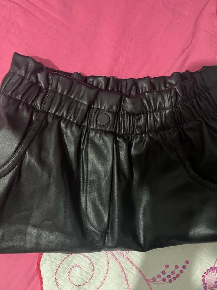 Siyah deri mini şort, fırfır detaylı ve bol kesimli, sokak stili ve günlük kullanım için uygundur.