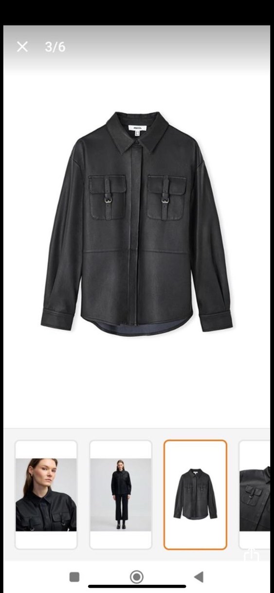 Uzun kollu, siyah deri ceket. İki göğüs cebine ve klasik yakaya sahip, sade ve şık görünümlü.