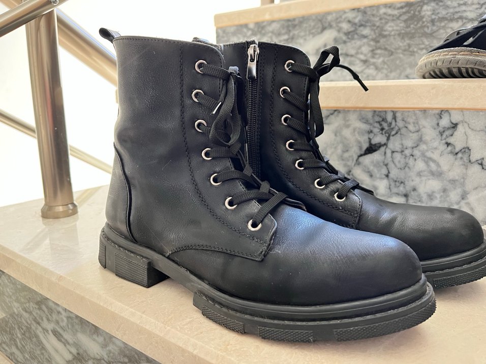Siyah deri goth bağcıklı botlar, blok topuklu ve yan fermuarlı, günlük kullanım için uygundur. Sağlam tabanlıdır. Yeni aldım 3 kere anca kullandım içi polarlıdır.