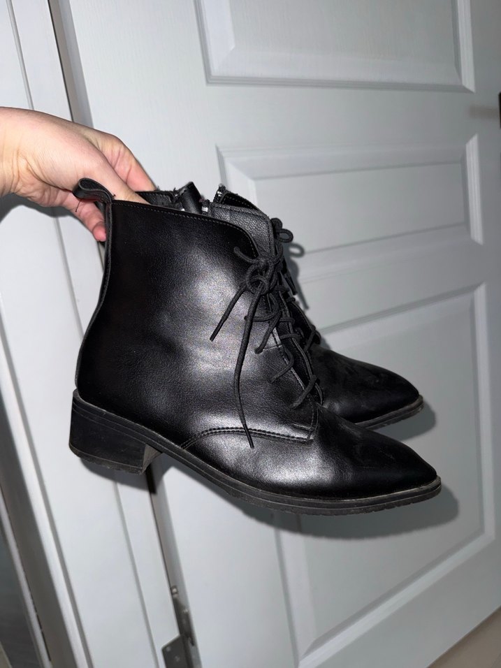 Siyah deri goth botlar, stiletto topuklu ve tokalı detaylara sahip. Desensiz ve şık tasarım, günlük ve ofis kullanımı için uygundur.