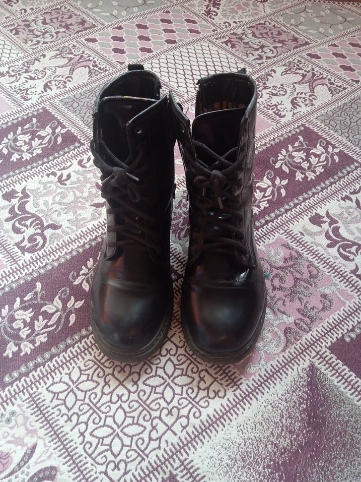 Siyah deri goth botlar, blok topuklu ve tokalı detaylara sahip. Günlük kullanıma uygun, rock punk havasında, desensiz ve koyu renkli.