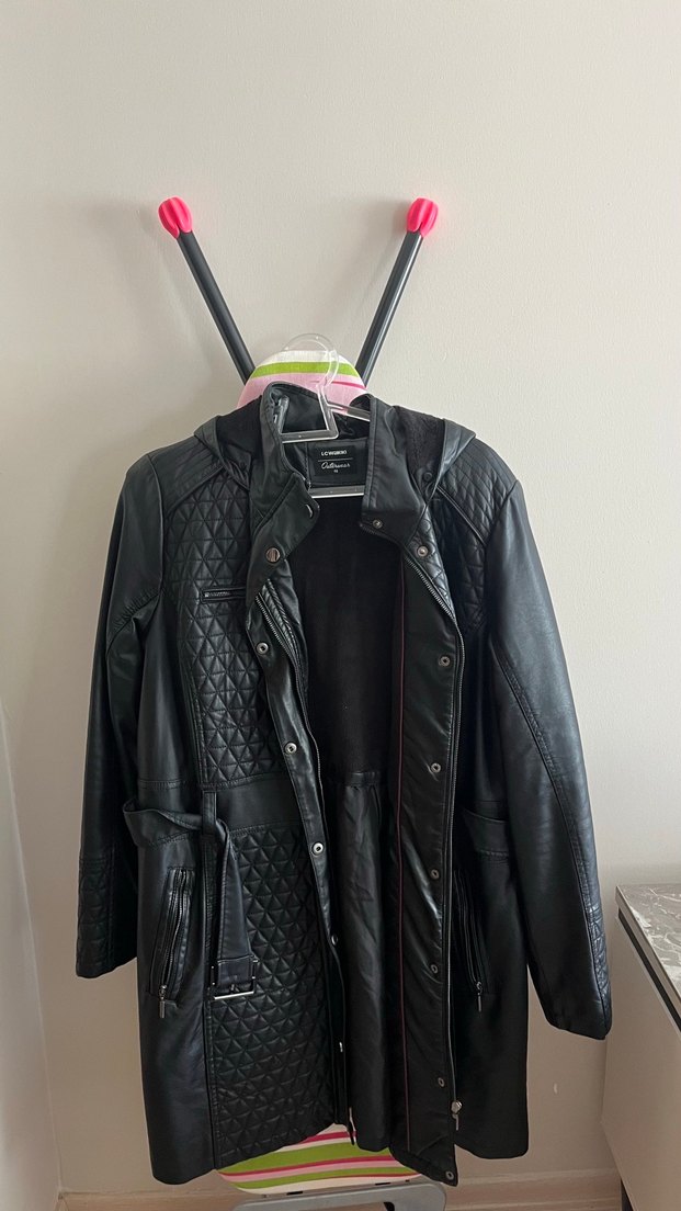 Siyah, deri, fitted kesim, çıtçıtlı ve fermuarlı, notalı yaka ve askılı kollu, midi boyda günlük kullanıma uygun goth tarzı kadın ceketi.