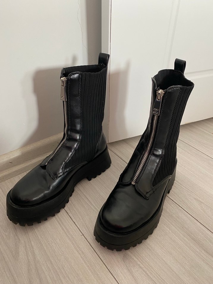 Siyah deri goth botlar, platform topuklu ve ön fermuarlıdır. Günlük kullanım için şık ve rahat bir seçimdir.