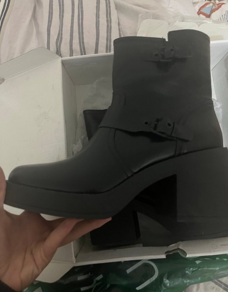Siyah deri, tokalı, blok topuklu kadın botu, gotik tarzda günlük kullanıma uygun.