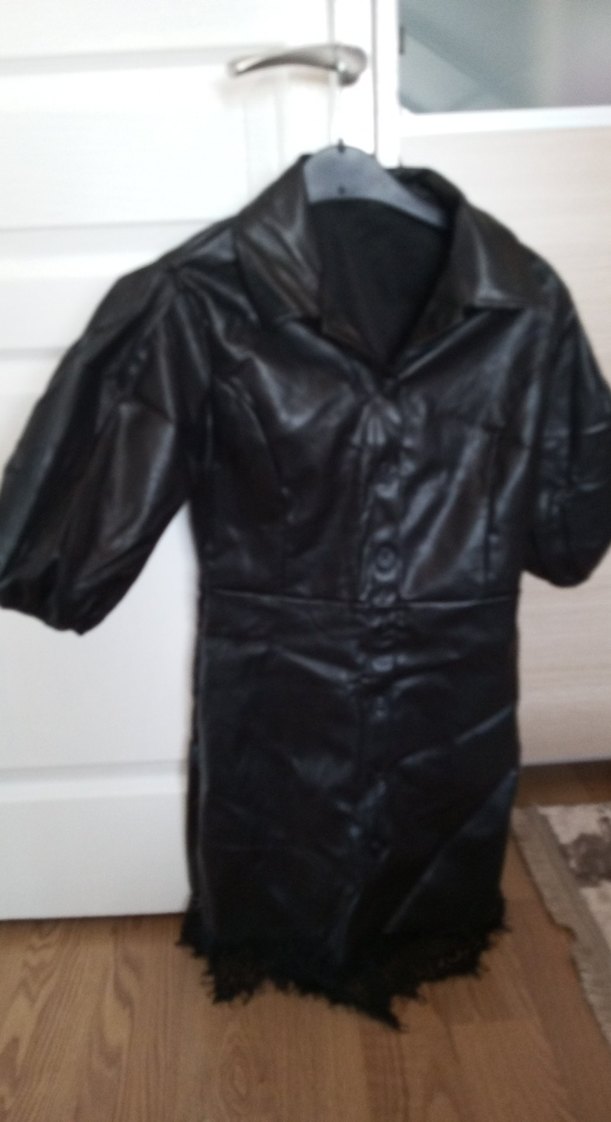 Kadın Siyah Deri Gotik Kısa Kollu deri danteli elbise boy