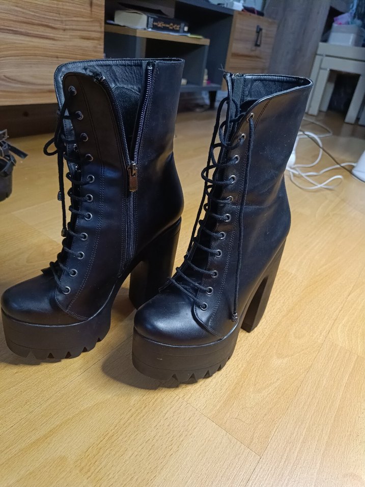 Siyah deri kadın bot, platform topuklu, bağcıklı ve yan fermuarlı. Gotik ve cesur tarz, günlük kullanım için uygun.