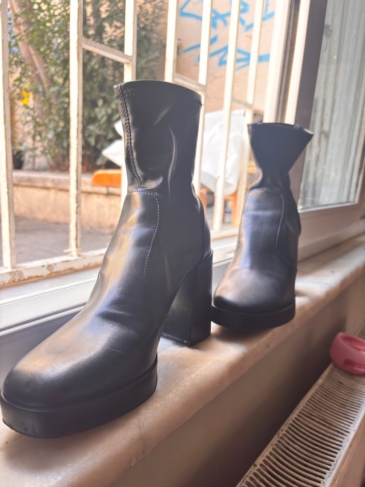 Siyah deri kadın botları, platform topuklu ve tokalı detaylara sahip cesur gotik tarzda. Günlük kullanım için uygun.