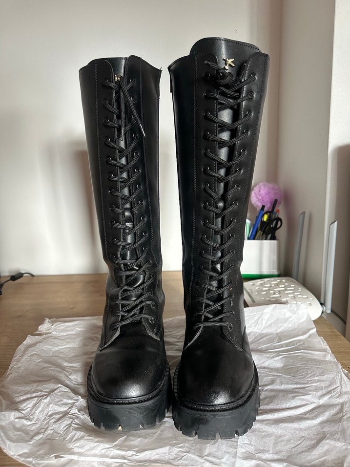Siyah deri gotik çizme, platform topuklu ve tokalı, önü bağcıklı tasarıma sahip. Günlük kullanım için uygun, cesur ve modaya uygun bir görünüm sunar. Kutusuyla birlikte gönderilecektir kargoda her hangi bir hasar oluşmaması için içleri kağıtla doludur. Güvenle satın alabilirsiniz