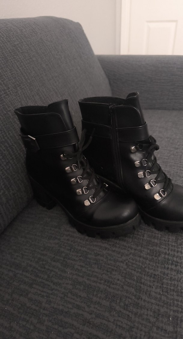 Günlük kullanım için tokalı, blok topuklu siyah deri gotik botlar, trend günlük tarzıyla uyumlu.