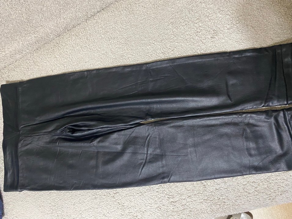 Kadınlar için siyah deri, fermuarlı, uzun ve dar kesim biker tarzı pantolon, minimalist ve ofis kullanımı için uygun.