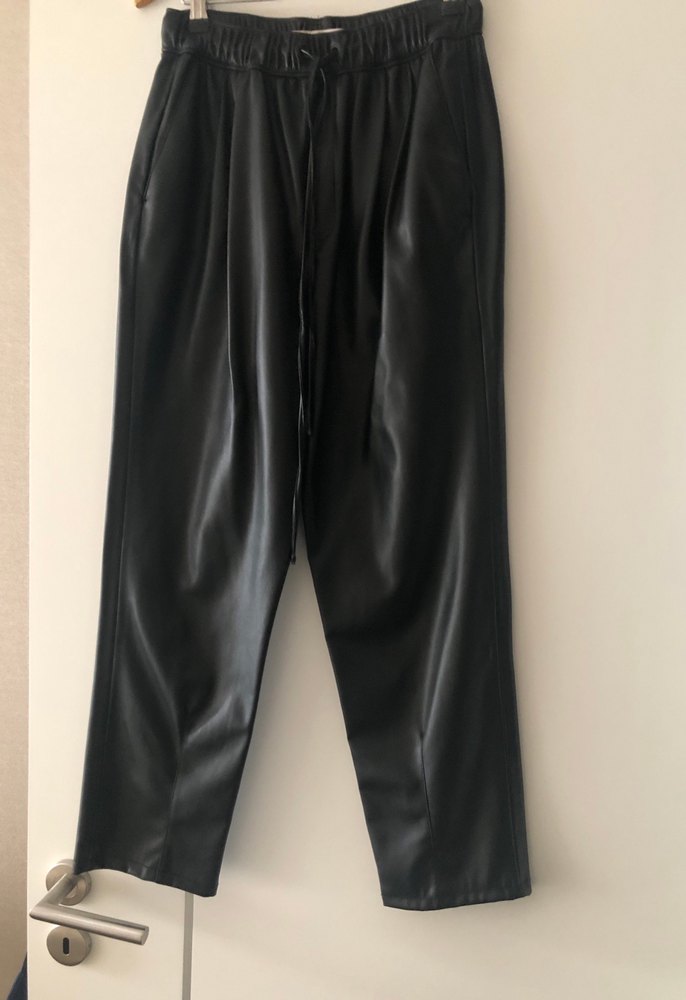 Siyah deri midi boy bol kesim pantolon, kemerli bel detayıyla minimalist ve trend ofis stiline uygun. Desensiz tasarımı şıklık katıyor.