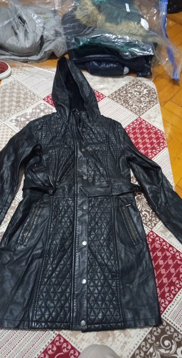 Uzun boy siyah deri biker ceket, kapüşonlu ve kemerli. Yılan desenli, dar kesim ve uzun kollu, sokak stiline uygun.