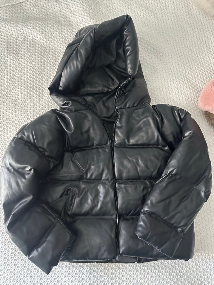 Kadın Siyah Deri Kapüşonlu Şişme Mont