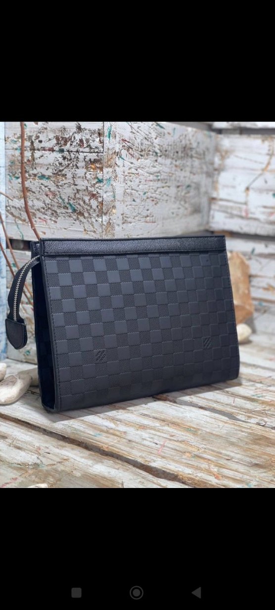 Siyah deri kare desenli, fermuarlı clutch çanta, modern klasik tarzda iş şıklığını günlük kullanıma taşıyor.