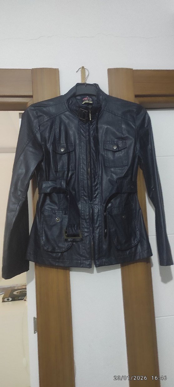 Kadınlar için siyah deri biker ceket, kemerli ve kesik yaka detaylıdır. Uzun kollu, normal kesim ve midi boyda, günlük kullanıma uygundur.