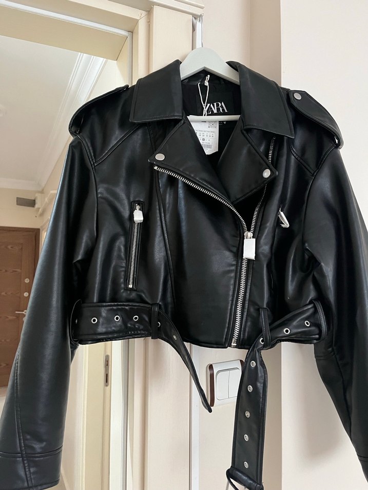 Kemerli bel, strappy kollu ve kesik yaka detaylı siyah deri biker ceket. Mini boy, günlük kullanıma uygun.