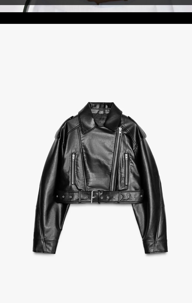 Siyah deri biker ceket, yakalı, kayış detaylı kollu ve kemerli bel kısmına sahiptir. Kısa ve mini boyda, günlük kullanım için uygun, grunge punk tarzında.