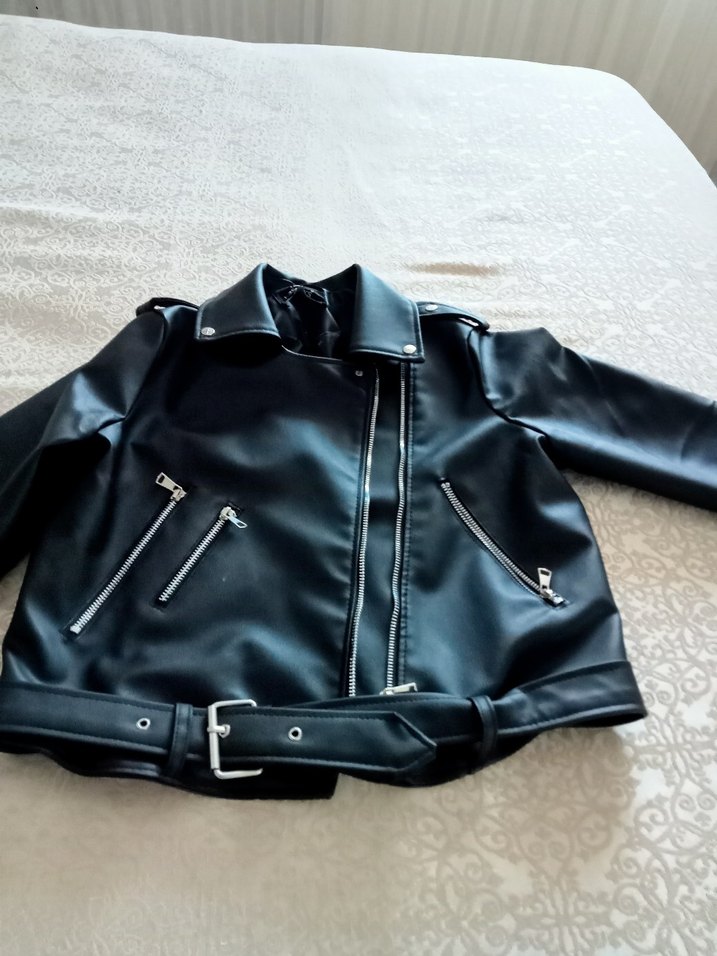 Kemerli ve fitted kesime sahip siyah deri biker ceket. Notched yakalı ve askılı kolludur, sokak stiline uygundur.