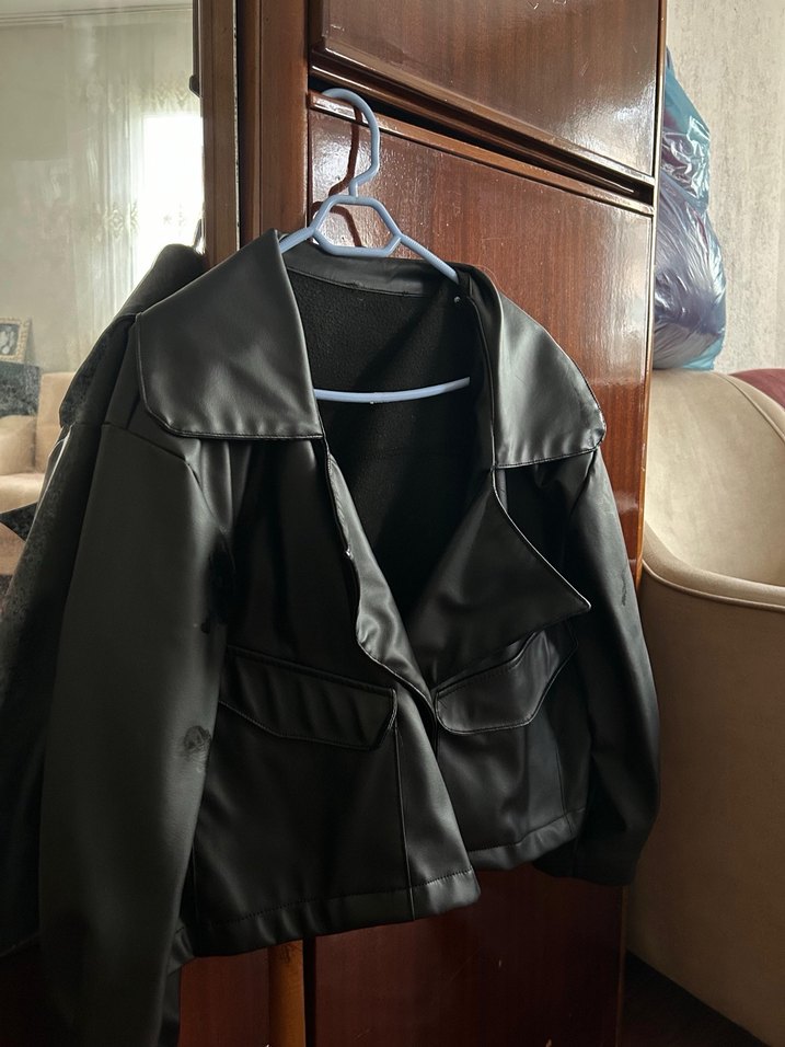 Bu siyah deriden kemerli ceket, yaka detayı ve askılı kollara sahip. Normal midi uzunlukta, goth tarzında ve desensiz, günlük kullanıma uygun.