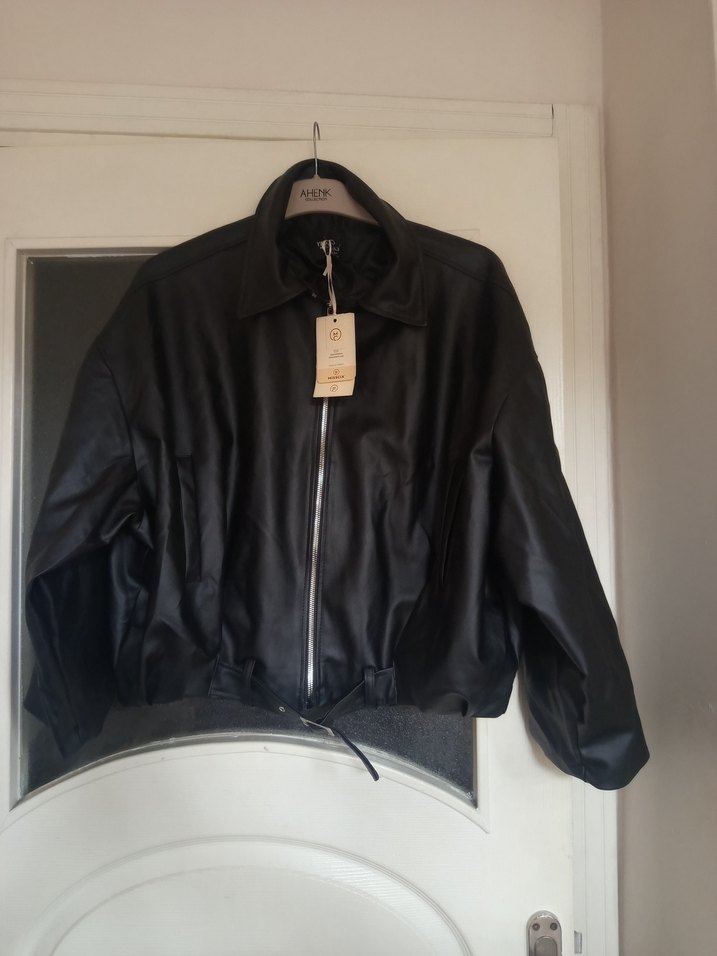 Parlak siyah deri, uzun kollu, kemerli ve bol kesim detaylarıyla sokak modasına uygun kadın ceketi. m yazıyor ama xl ye kadar olur salaş .