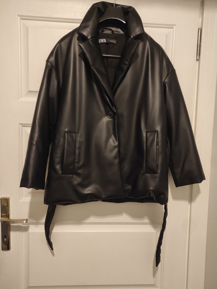 Siyah deri ceket, kemerli ve kesik yakalıdır. Askılı kolları ve midi boyu ile minimalist sokak tarzına uygun, günlük kullanıma idealdir oversize kalıptır