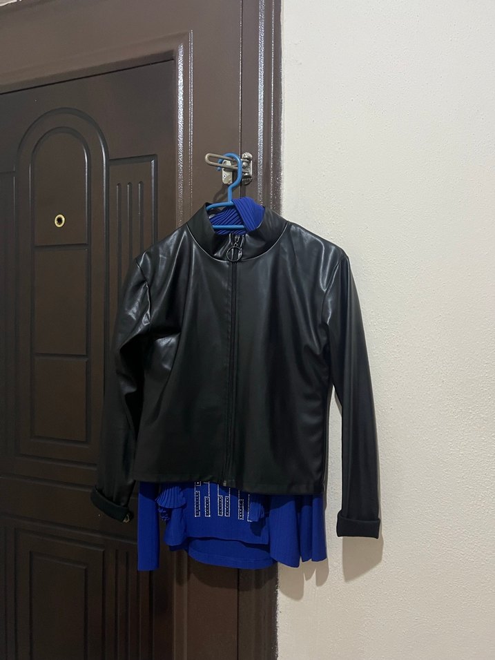 Kadınlar için yüksek yakalı, uzun kollu ve kemerli, vücuda oturan siyah deri ceket. Sokak stiline uygun, desen içermeyen koyu renk tasarım.