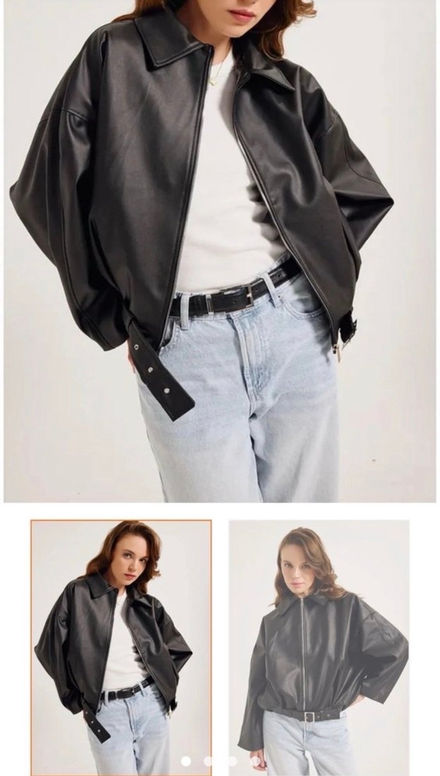 Kadın siyah deri ceket, normal kesim, kemerli ve notalı yakalıdır. Askılı kollara ve midi boy uzunluğa sahiptir, günlük sokak stiline uygundur.