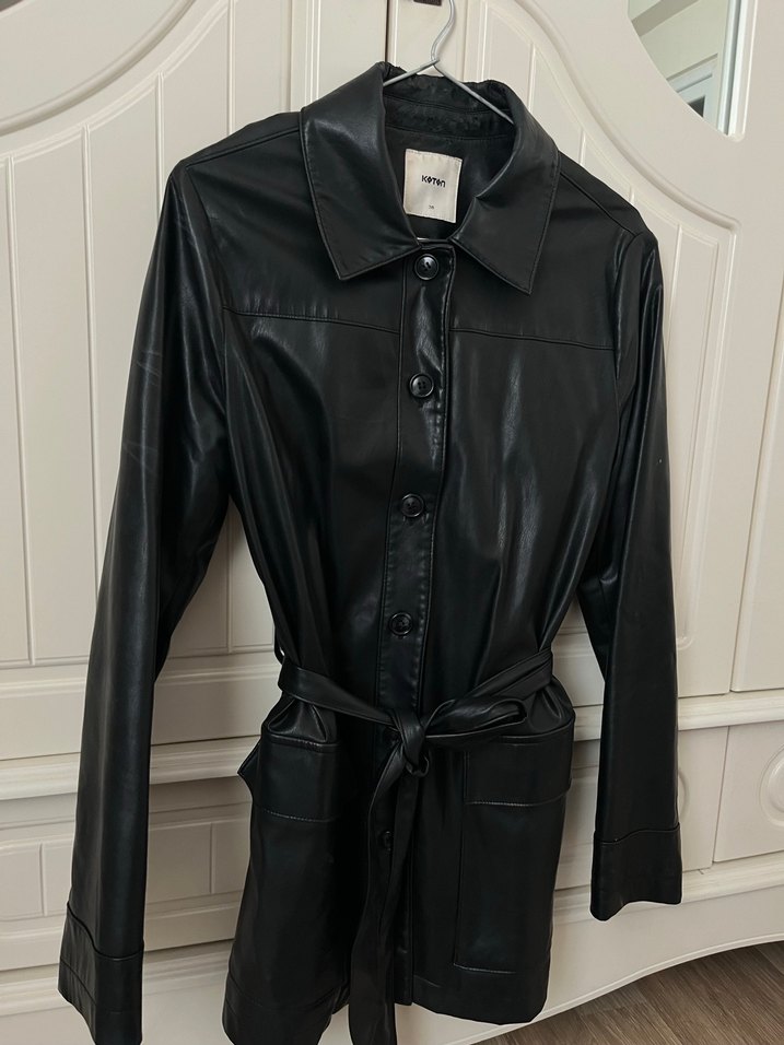 Siyah deri, kemerli, klasik yakalı, normal uzunlukta kadın ceket. Ofis ve günlük kullanıma uygun, rahat kesim ve uzun kollu. Biraz boyun kısmında deforme var sadece