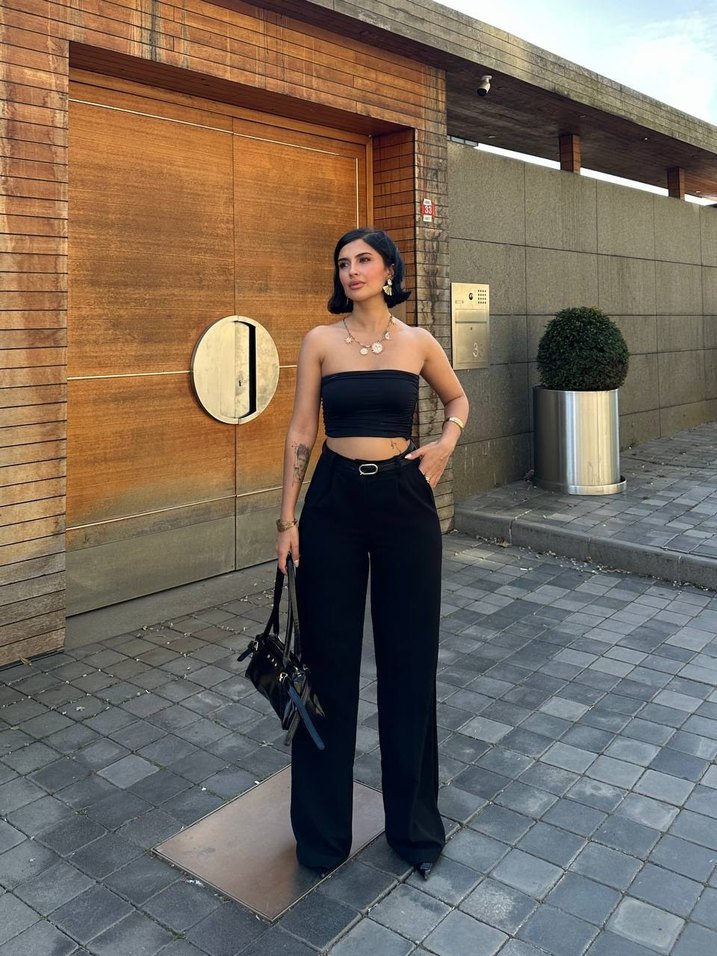 Kadınlar için siyah deri cigarette pantolon, regular fit ve midi boyda. Kemerli ve desensiz, günlük sokak stili için uygun.