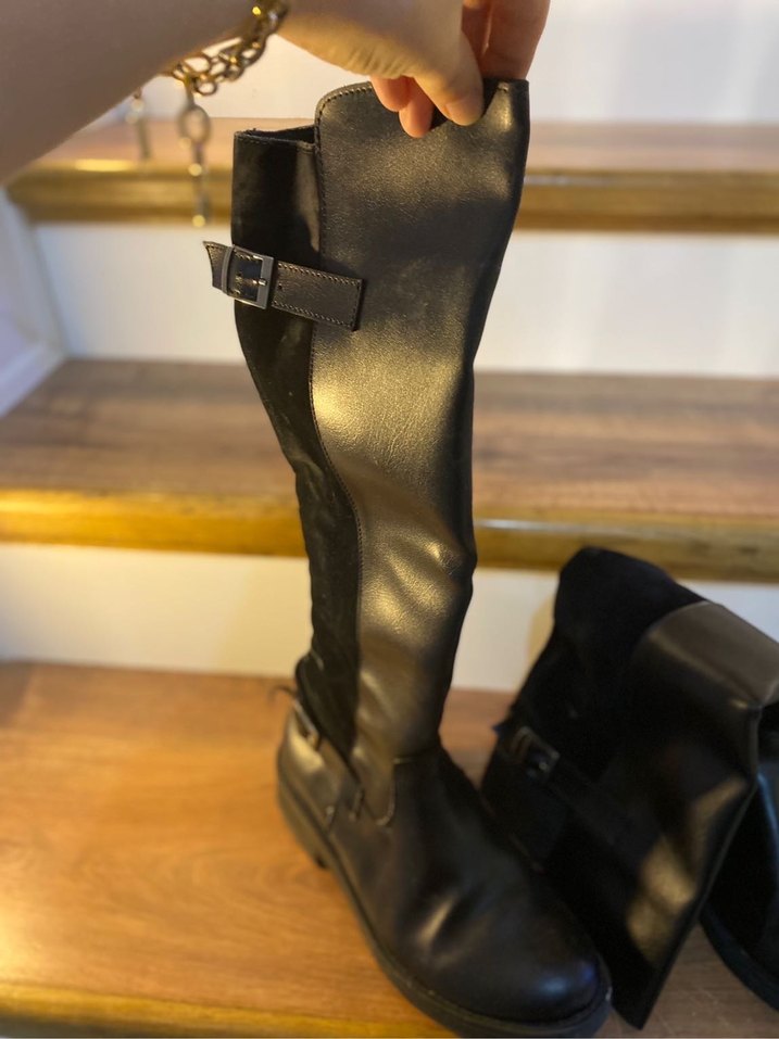 Siyah deri tokalı, ince topuklu gotik tarzda kadın çizmesi, günlük kullanıma uygun.