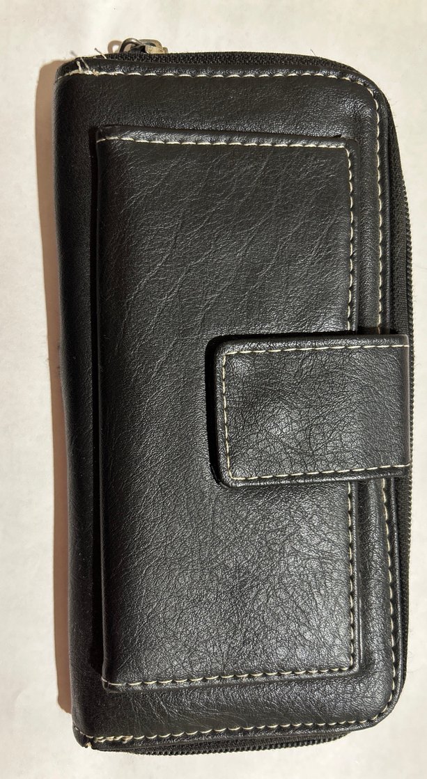 Kemerli kapaklı siyah deri kadın cüzdanı, minimalist, günlük kullanıma uygun desensiz tasarım.