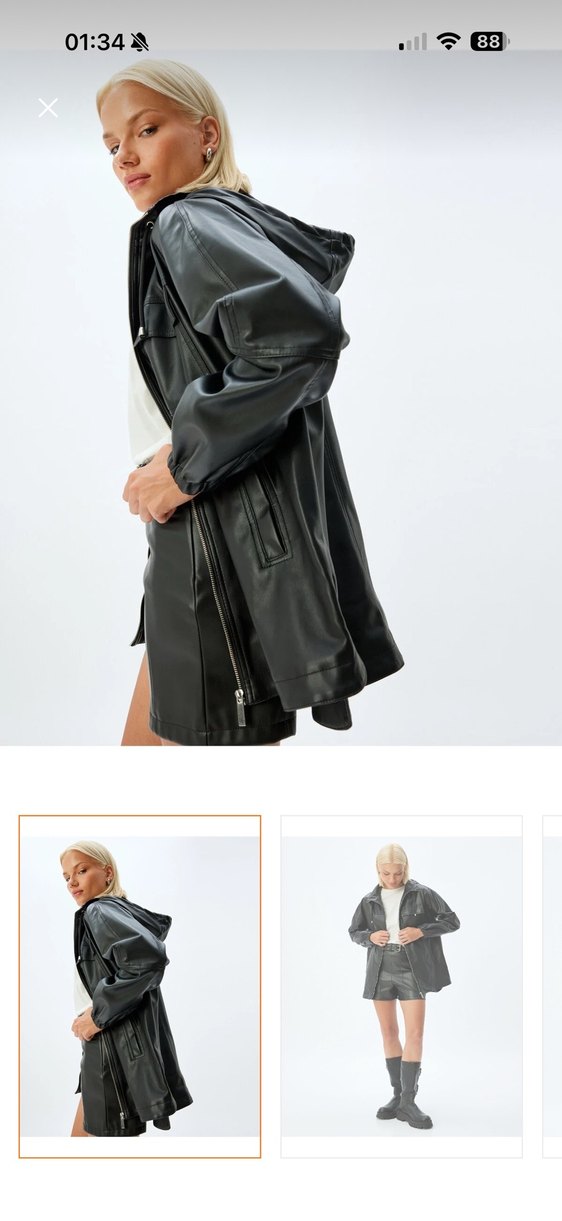 Siyah deri, kemerli mini ceket, kesik yaka ve bantlı kollara sahip, düzenli kesim. Sokak stiline uygun.