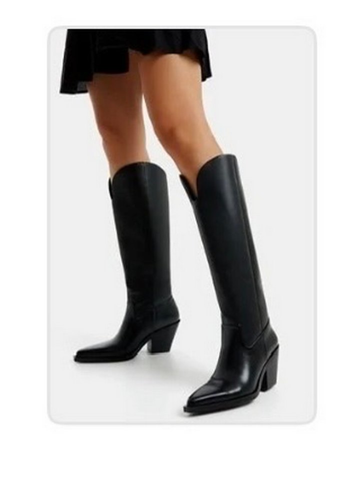Siyah deri kemerli dizüstü botlar, blok topuklu olup minimalist gotik tarzı ve trend günlük giyimi bir araya getirir.