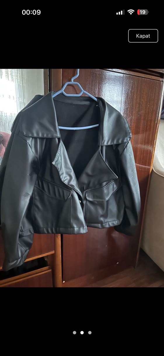 Siyah deri, kemerli, kısa kesim kadın ceketi, uzun kollu ve yaka detaylıdır. Günlük kullanıma uygun gotik stilde klasik bir seçimdir.