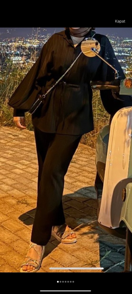 Bu siyah deri kadın takımı, yaka detaylı ve askılı kollu olup, kemerli bel tasarımıyla trend sokak stilini yansıtıyor. Normal kesim ve midi boydadır.
