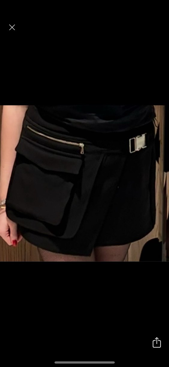 Kemer ve fermuarlı cep detaylı, dar kesim siyah deri mini etek. Sokak modası ve Paris tarzını yansıtan günlük kullanıma uygun parça.