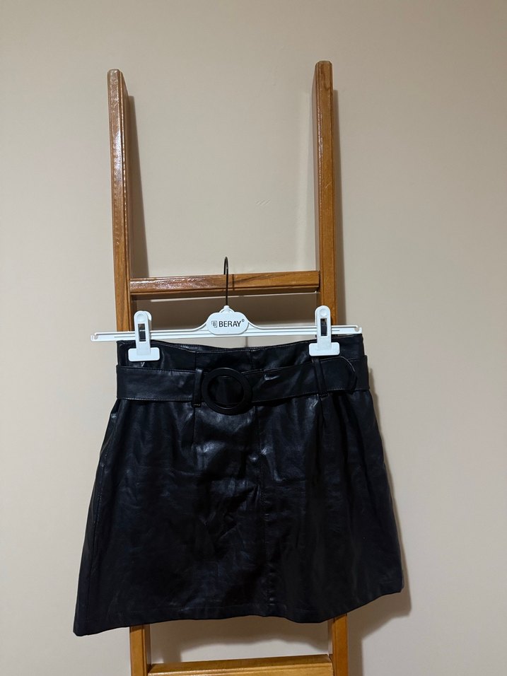 Siyah deri mini etek, kemerli ve dar kesimdir. Paris tarzı gotik stil sunar, günlük kullanıma uygundur.