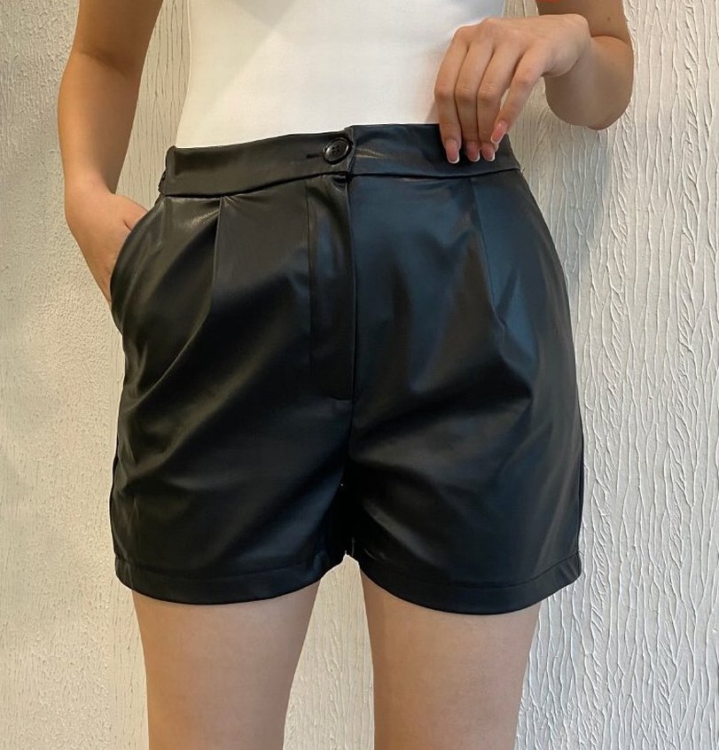 Kemer detaylı, kısa boylu, siyah deri mini şort. Sade desenli, rahat ve sokak stili için uygun, vücuda oturan kesim. 0370te