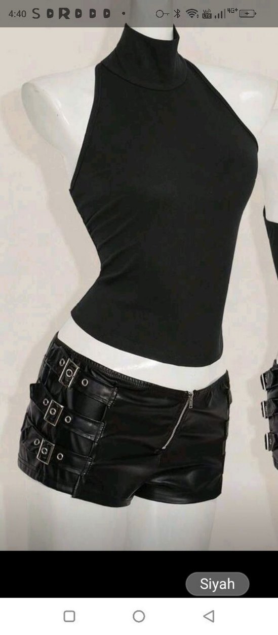 Siyah deri, kemerli ve dar kesim mini şort. Gotik tarzda, kısa boylu ve desensiz, cesur günlük kullanım için uygundur.
