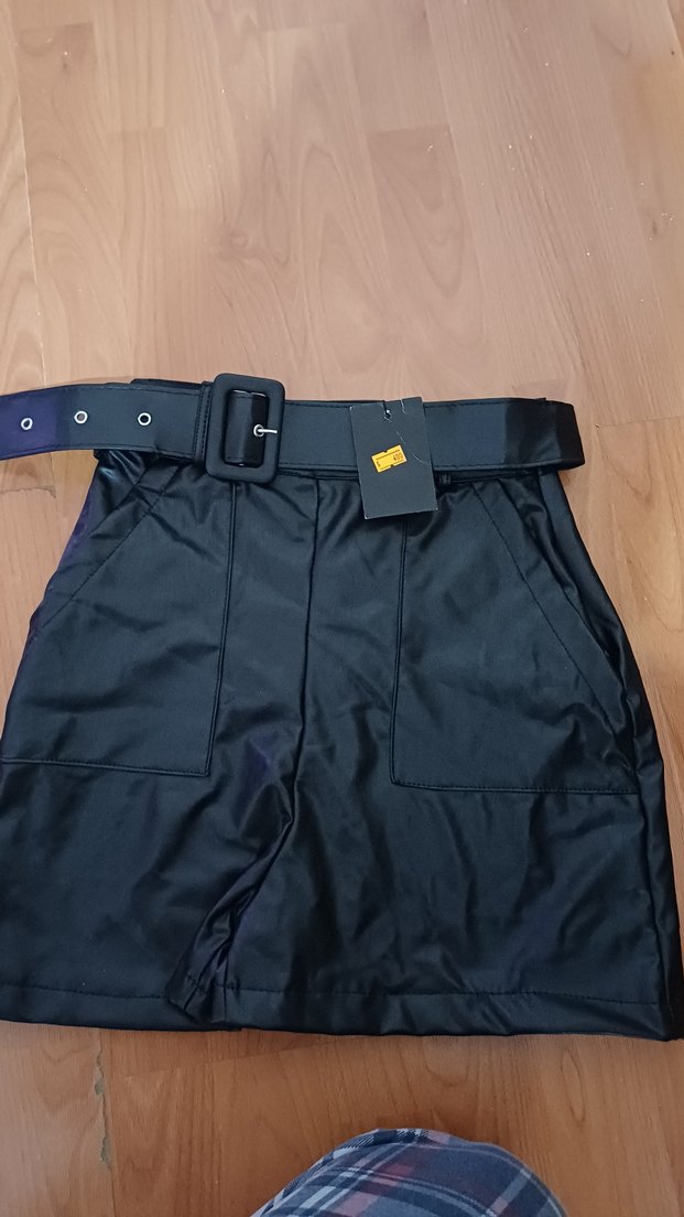 Kadın Siyah Deri Kemerli Mini Şort