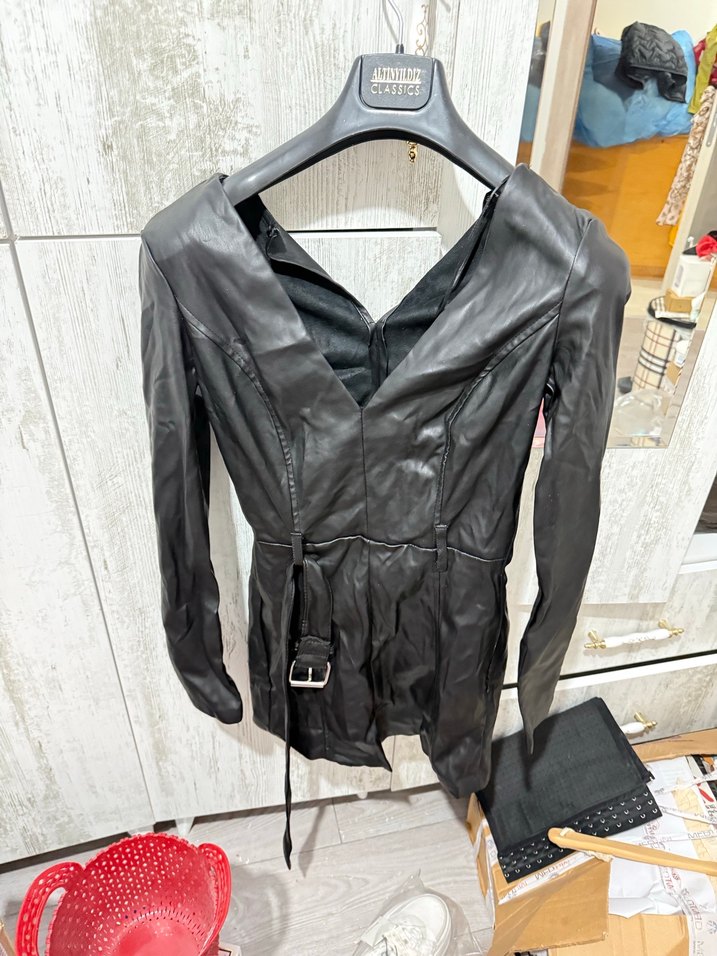 V yakalı, kemerli ve askılı kollu siyah deri, dar kesim mini tulum. Günlük kullanıma uygun sokak tarzı şıklık sağlar.