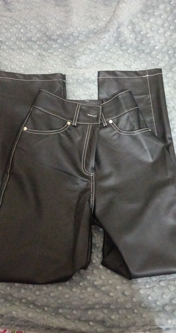 Kadınlar için siyah deri, kemerli ve normal kesim pantolon. Sokak stiline uygun, desen içermeyen şık tasarım.
