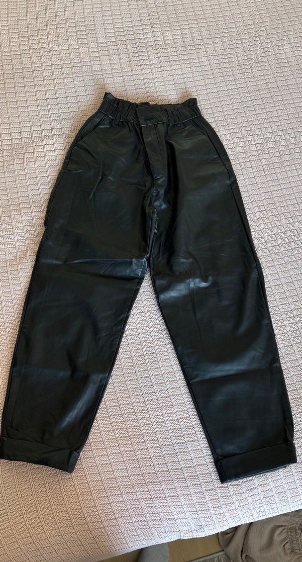 Siyah deri kadın pantolon, kemerli ve rahat kesim. Midi boy, sokak stiline uygun günlük kullanıma uygun.
