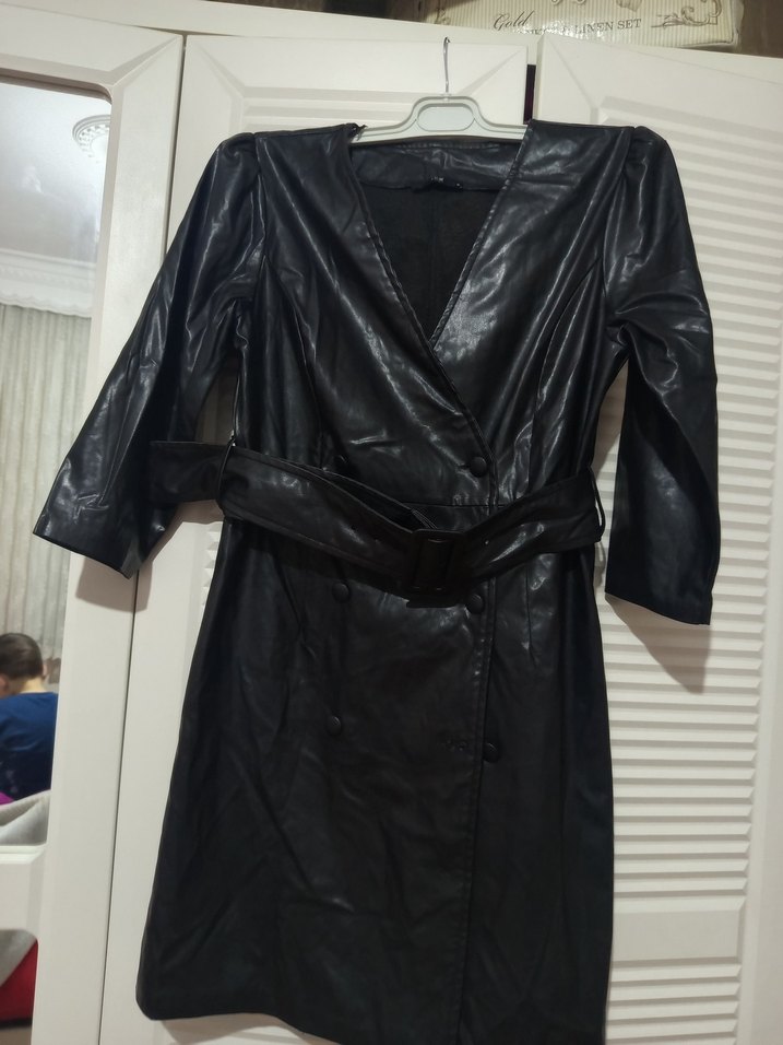 Fermuarlı, kemerli, uzun siyah deri ceket, keskin yakalı ve askılı kollu, şık ve fit kesim ofis için uygun.