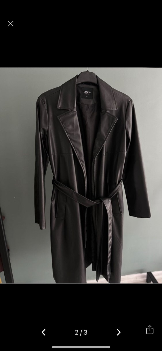Kadın siyah deri, kemerli ve uzun kesim ceket. Notlu yaka ve askılı kollarıyla ofis ve sokak stiline uygun, regular fit.