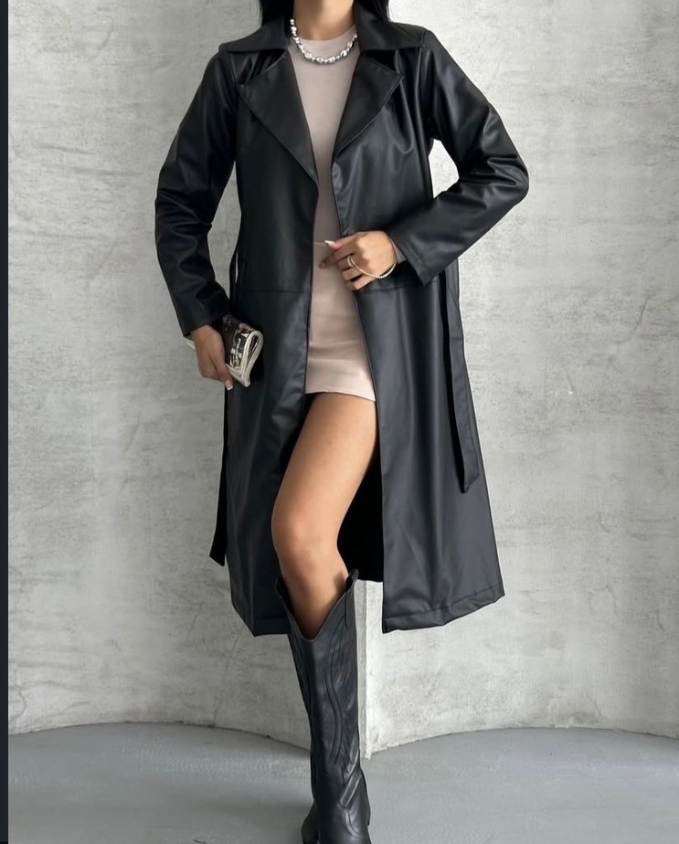Siyah deri, kemerli, uzun trençkot. Notlu yakalı, düzenli kesimli ve askılı kollu, ofis için uygun. Sıfır etiketli üründür geri iade yoktur.
