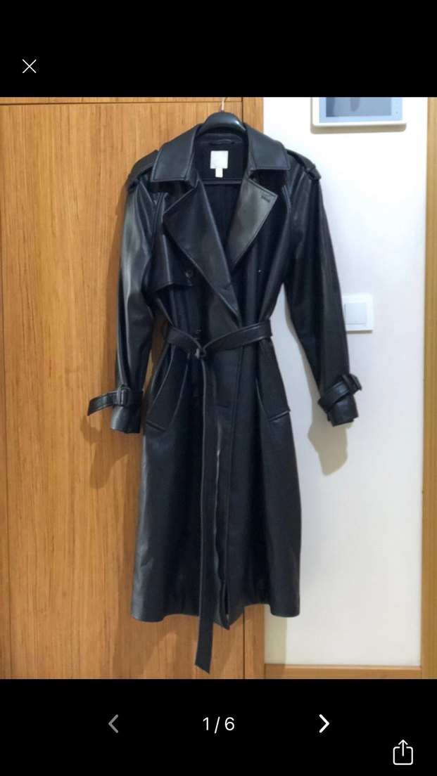Kadın siyah deri trençkot, kemerli ve askılı kollu, kesik yaka ve regular fit ile uzun boyda. goth ve Paris tarzı etkisiyle sade ve şık.