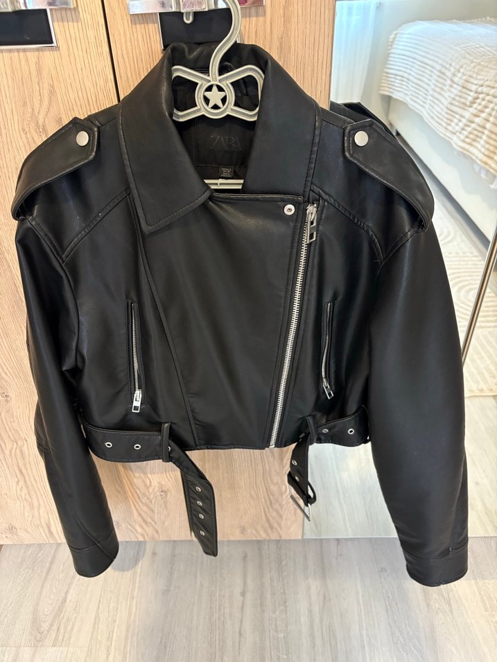 Fitted kesim siyah deri biker ceket, kesik yakalı ve askılı kollu, tokalı detaylara sahip. Kısa boy ve grunge punk tarzını yansıtır, günlük kullanım için uygun.